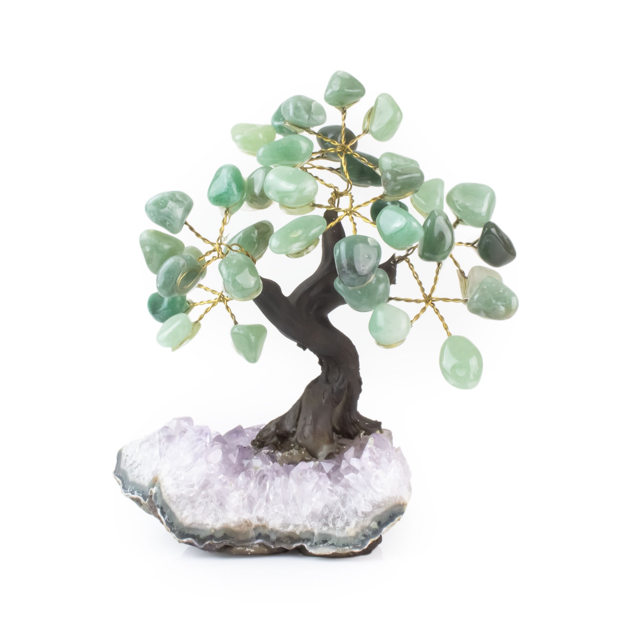 Bring the refreshing energy of nature into your space with this green quartz tree. Its wire-wrapped branches are adorned with vibrant green quartz stones, known for fostering balance and emotional healing. The tree is rooted on a raw amethyst base, creating a stunning blend of earthy and tranquil energies. Available in five sizes, this crystal tree is perfect for enhancing your home, workspace, or meditation area.