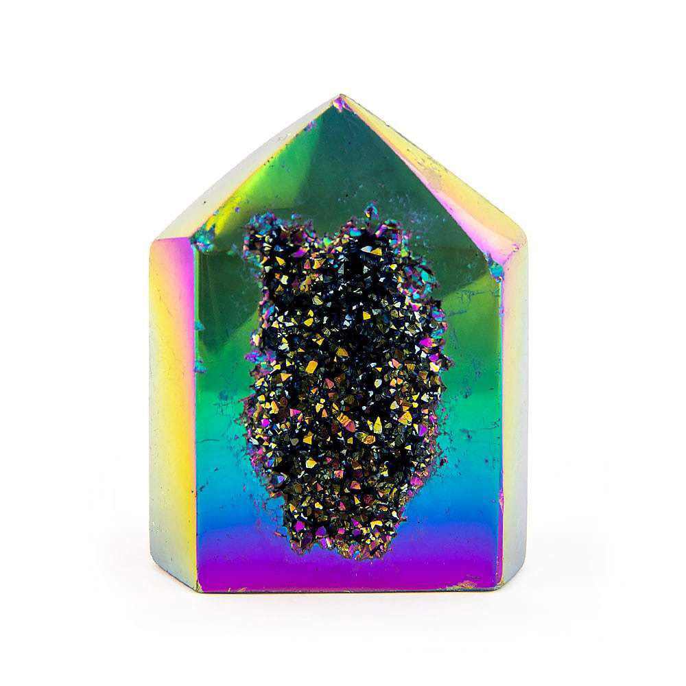 Born from the meeting of nature and innovation, the Rainbow Titanium Point is a symbol of transformation and creative energy. Each piece begins as natural quartz, formed deep within the Earth over countless years, then bonded with pure titanium through a high-heat vapor process. The result is a permanent fusion of metal and crystal that radiates a kaleidoscope of color, reflecting both strength and change.